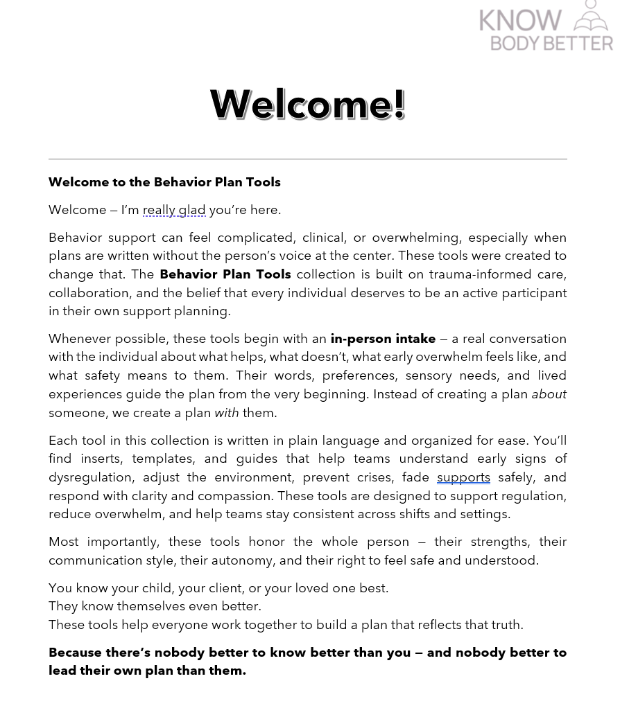 *Clear, practical supports for the moments that matter most.* This section is home to every resource designed to help families, educators, and support teams understand behavior, respond early, and create environments where people feel safe, regulated, and respected. These tools take the guesswork out of “What do I do right now?” and replace it with calm, consistent, dignity‑centered support. Whether you’re navigating early signs, building a behavior plan, or trying to make daily routines smoother, these tools give you the clarity and confidence you need — without the jargon, overwhelm, or clinical fog. ### **Inside this collection, you’ll find:** - **Precursor Identification Tools** Catch the moment before the moment with early‑sign recognition and supportive responses. - **Behavior Plan Tools & Inserts** Add clarity, structure, and plain‑language guidance to any Behavior Support Plan. - **Regulation & Coping Supports** Visuals, menus, and tools that help people communicate needs and stay regulated. - **Data & Documentation Tools** Simple, family‑friendly ways to track patterns without turning your life into a spreadsheet. - **Behavior Literacy Guides** Plain‑language explanations that help everyone understand the “why” behind behavior. - **Bundles** Curated sets that give you everything you need to support behavior across settings. Everything here is built to be: - easy to use - quick to implement - trauma‑informed - dignity‑centered - and actually helpful in real‑world settings No shame. No power struggles. No “just ignore it.” Just tools that help you support the human in front of you — not the behavior in front of you. Support doesn’t have to be complicated. **Know Body Better.**